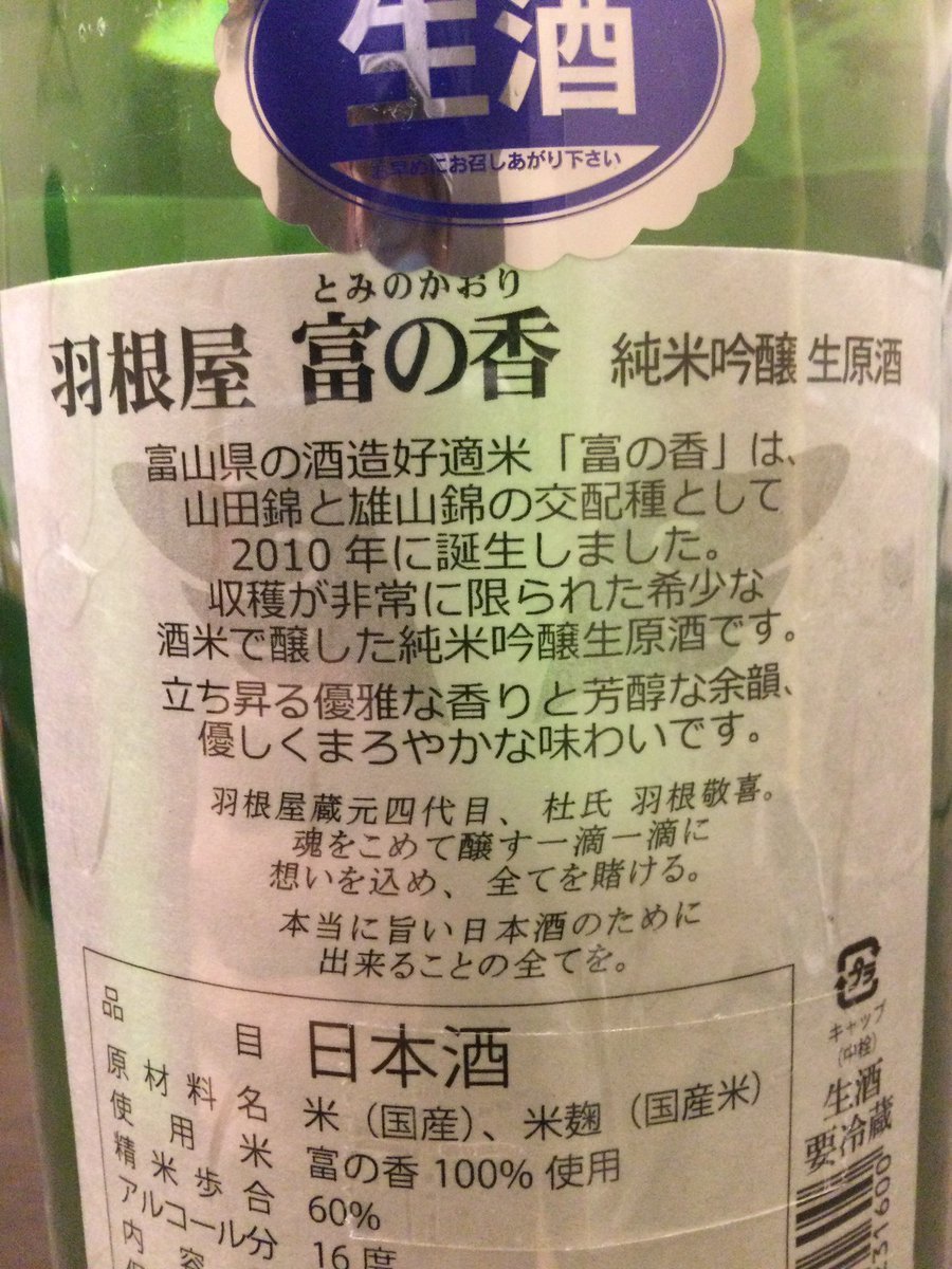 「羽根屋(富山県)“富の香”純米吟醸生原酒」の今年の新酒が届きました。