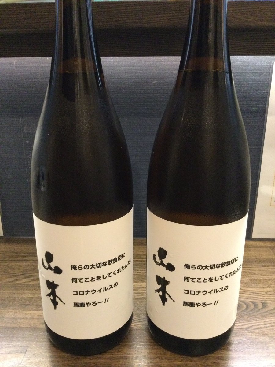ラベルには『俺らの大切な飲食店に何てことをしてくれたんだ! コロナウィルスの馬鹿やろー‼️』のメッセージが。