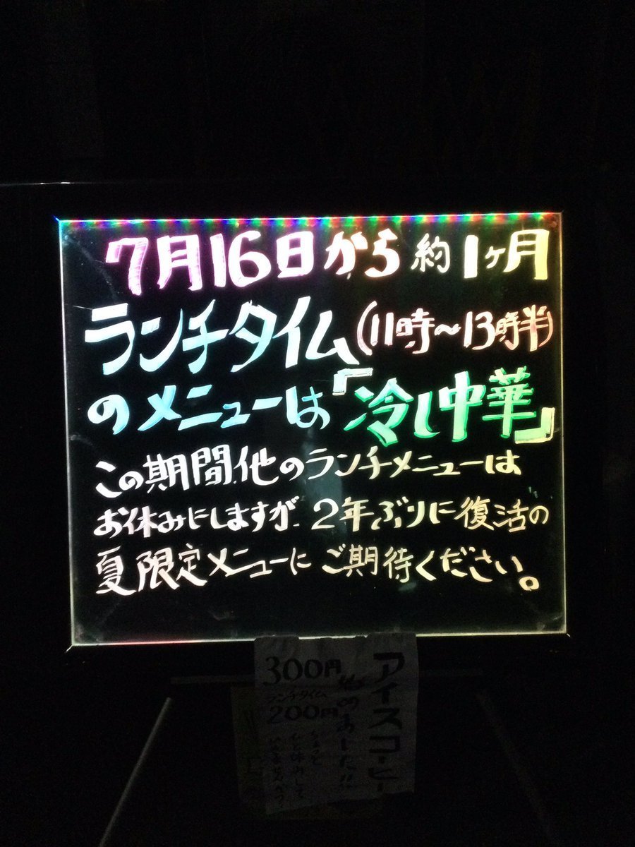 今週金曜日16日のランチタイムメニューから『冷やし中華』を始めたいと思います。