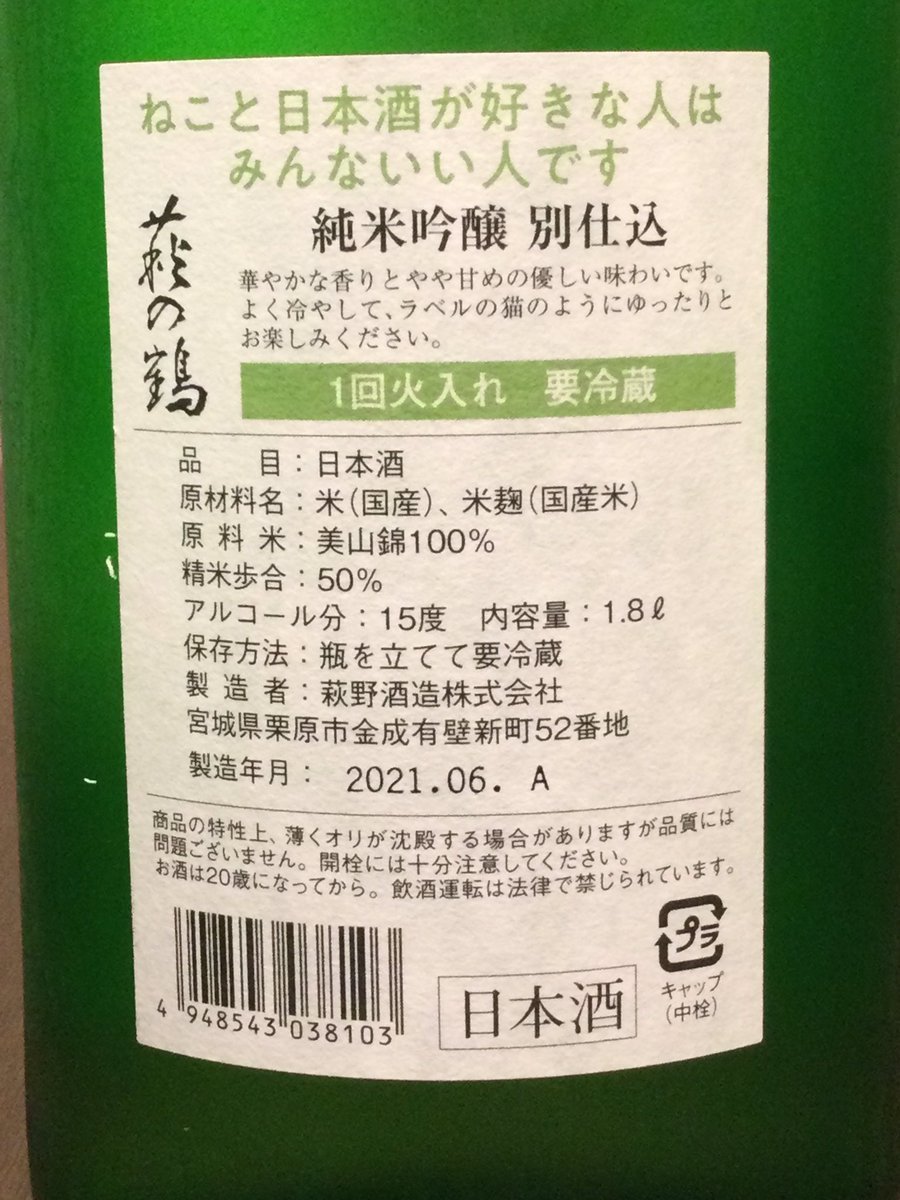 「萩の鶴(宮城県)純米吟醸別仕込み“真夏のネコ”」6月下旬発売でしたが、店頭の冷蔵庫に空きが無かったので今日から発売します。