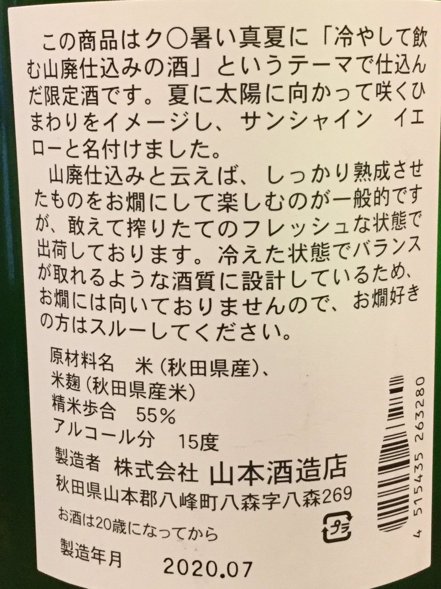 近日発売「山本(秋田県)純米吟醸“サンシャインイエロー”」一年ぶりに真夏の山本が戻って来ます。