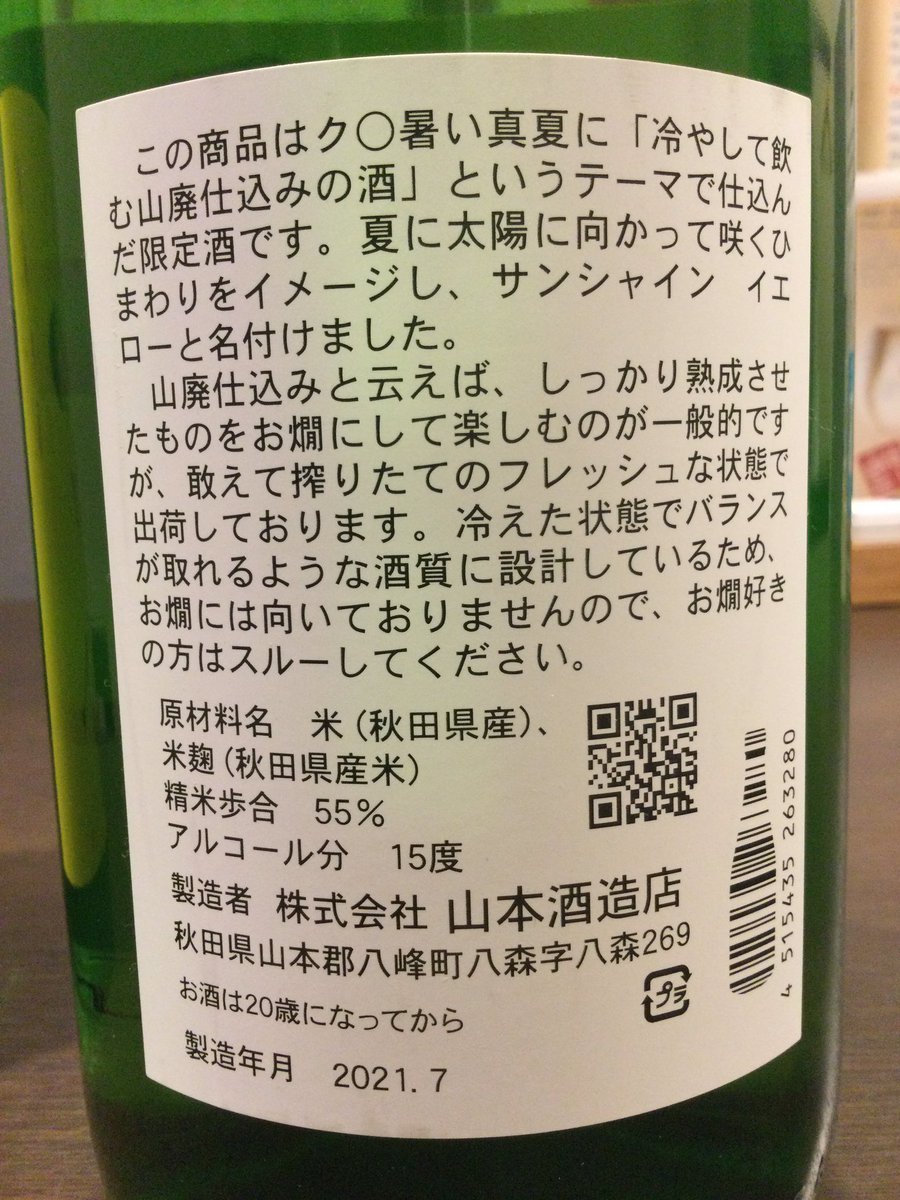 先程、秋田県から「山本 純米吟醸“サンシャインイエロー”」が届きました。