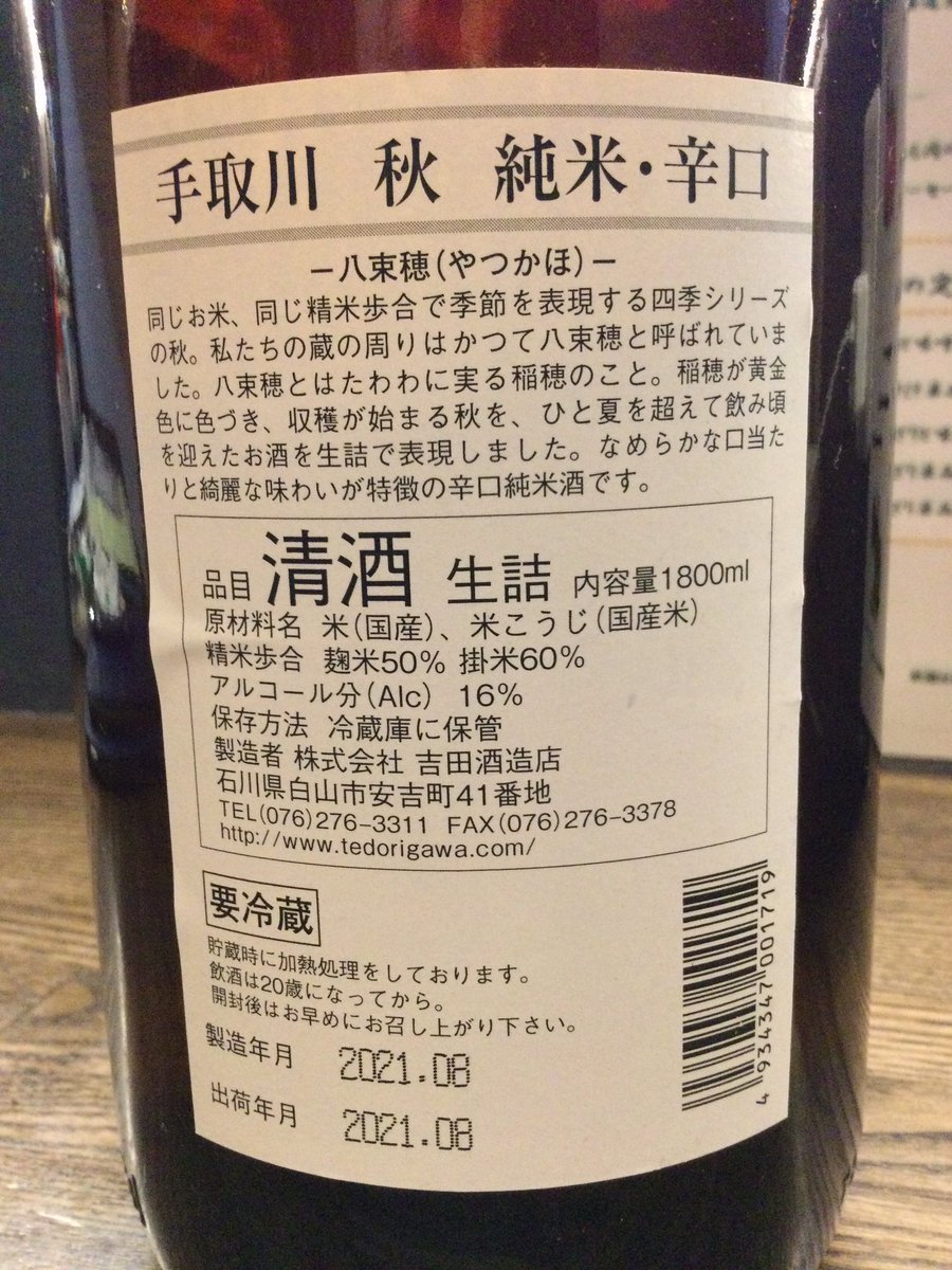 8月28日今もまだ休業中ですが、予約してあった「手取川(石川県)“秋”純米辛口」1本だけに減らして自分用に取り寄せました。