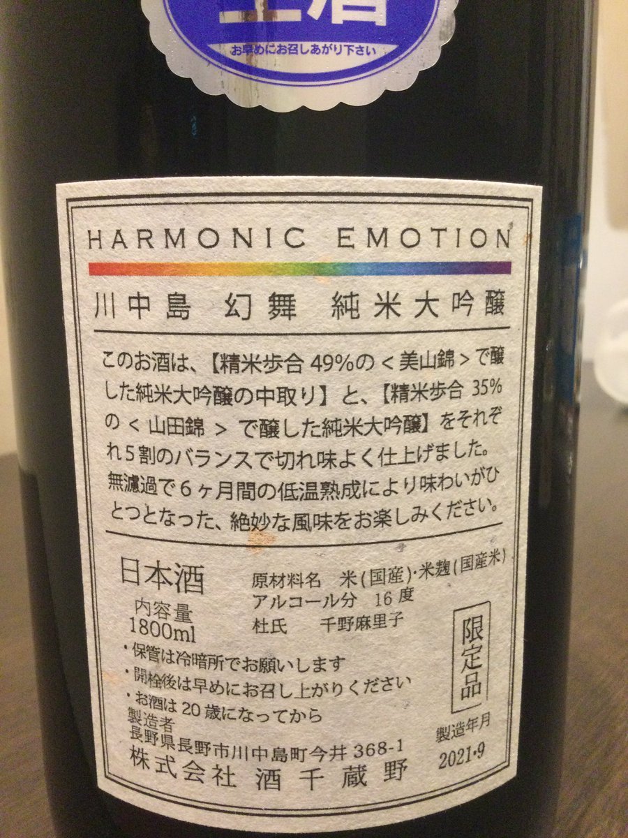 9月12日(土曜日)、今もまだ休業中ですが、今日は以前から予約してすっと楽しみにしていた「川中島 幻舞(長野県)純米大吟醸“ハーモニックエモーション”」が届きました。
