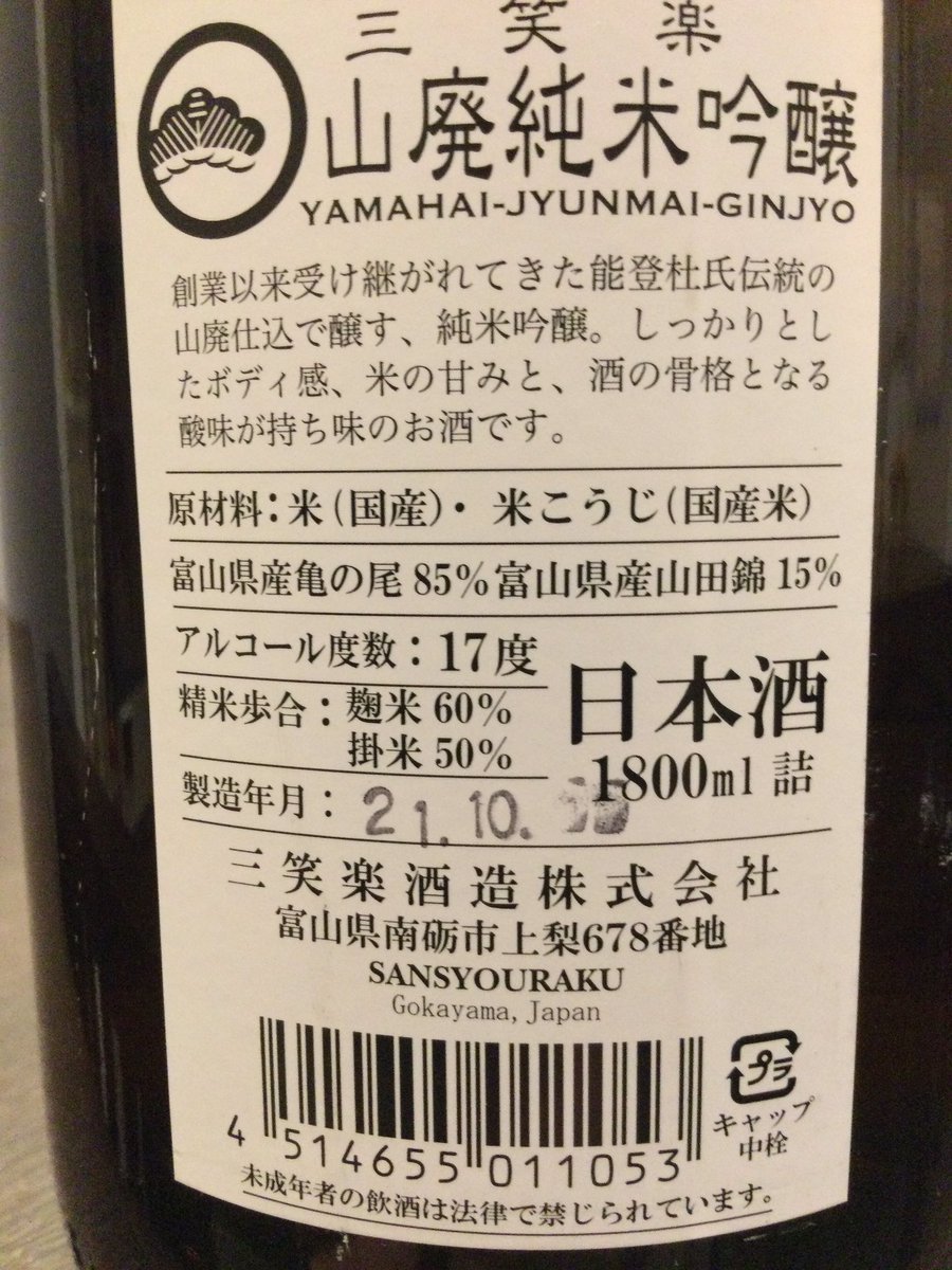 「三笑楽(富山県)山廃純米吟醸“亀の尾”」今年もこの銘柄が届きました。