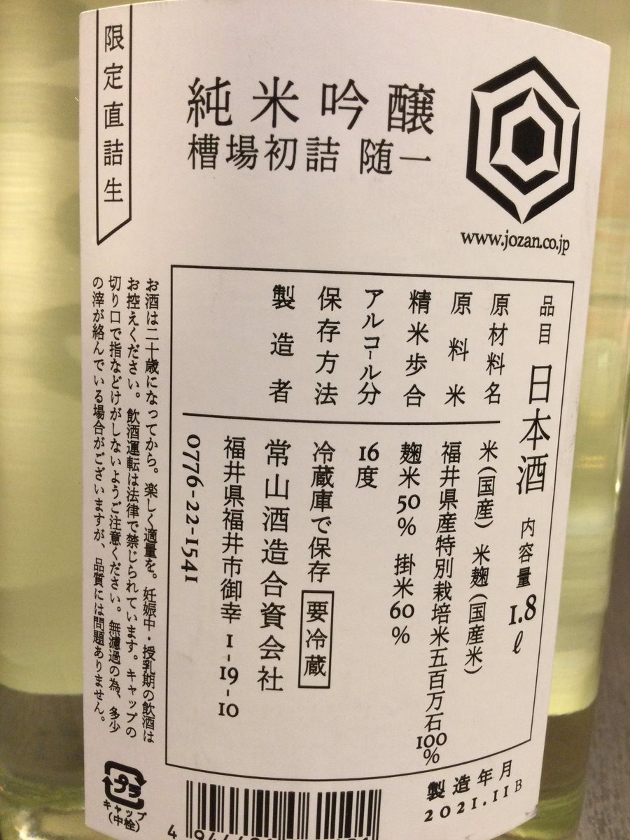 「常山(福井県)純米吟醸“槽場初詰 随一”」今年もこのお酒が入荷致しました。