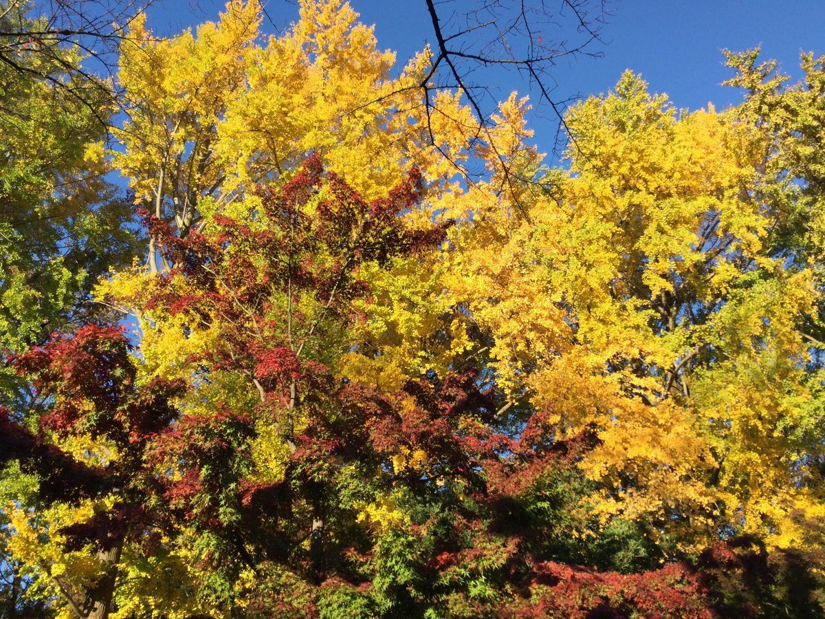 斜向かいの つきのみや公園のイチョウの木が黄色く色づき冷んやりした北東の風でハラハラと舞っています。