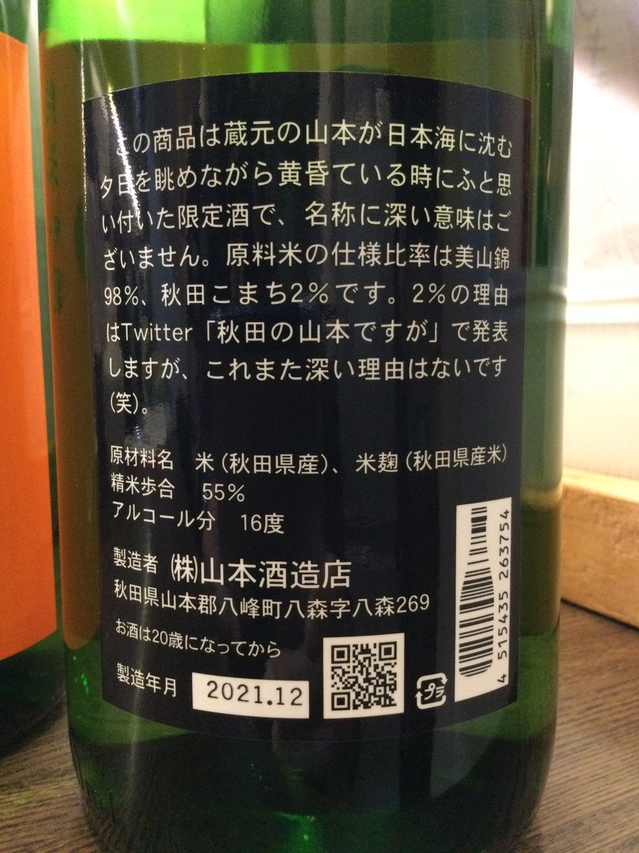 「山本(秋田県)純米吟醸生原酒“サンセット オレンジ”」本日から発売します。