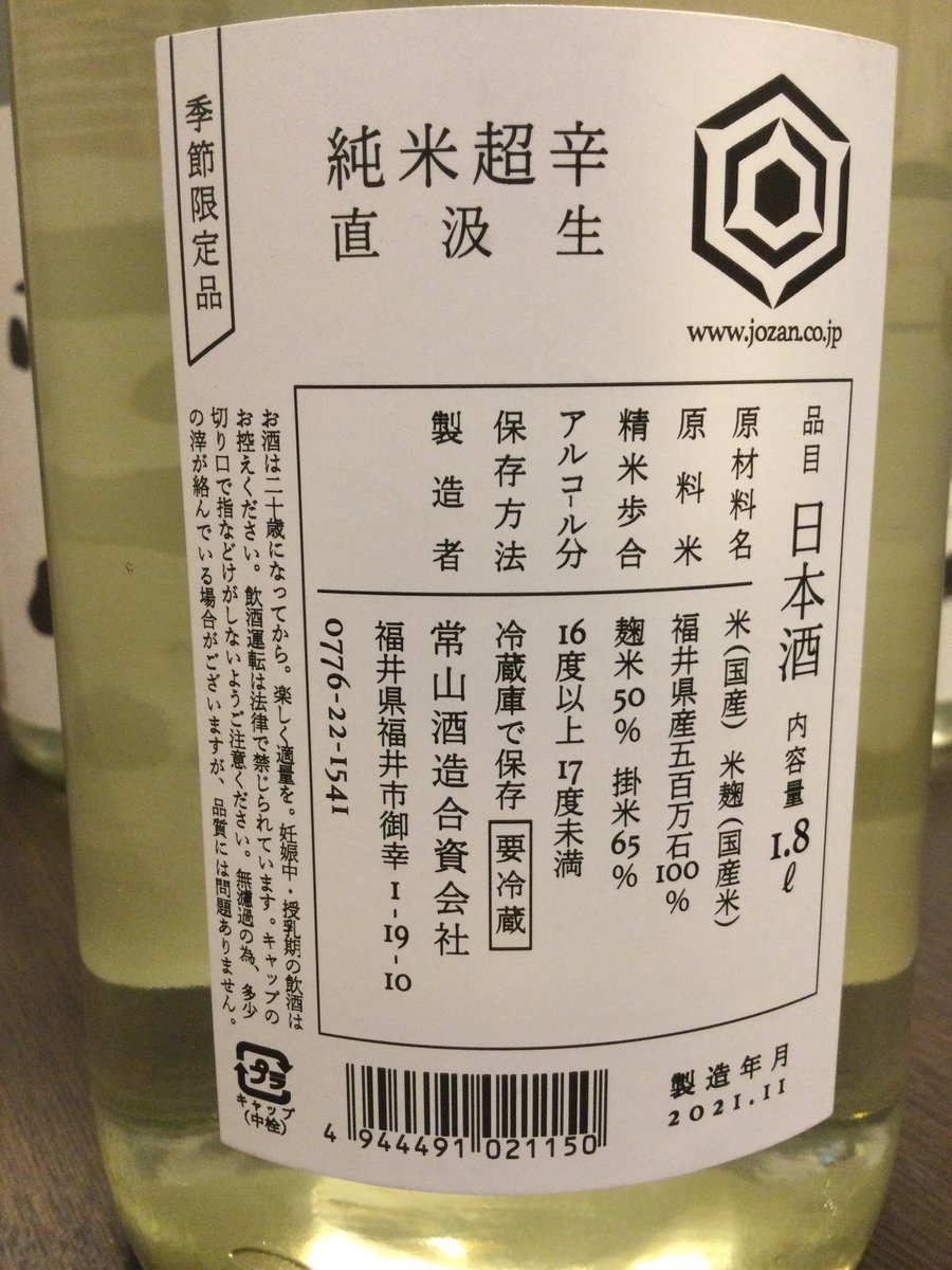 「常山じょうざん(福井県)純米超辛“直汲 生”」このお酒の火入れタイプは当店定番常備の穏やかな燗向け酒ですが、生はパンチが効いてレモンスカッシュを連想するような爽やかな味わいです。