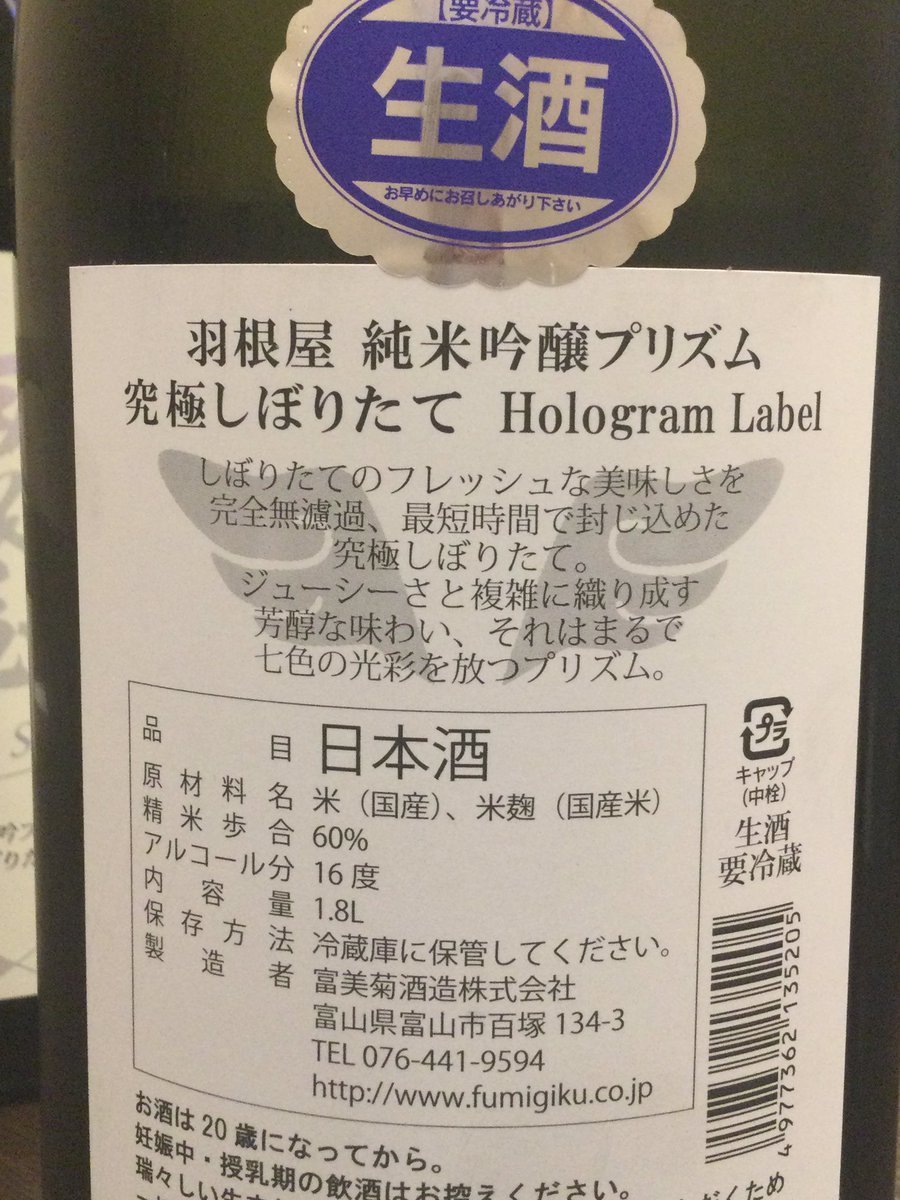 予約して楽しみにしておりました「羽根屋(富山県)純米吟醸“プリズム”」(画像は昨年)が、昨日発送され本日入荷する予定です。