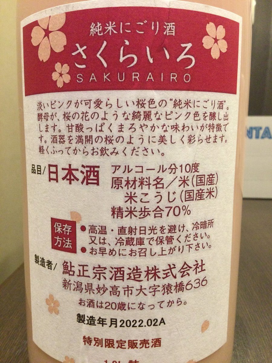 「鮎正宗あゆまさむね(新潟県)純米赤色酵母“さくらいろ”」満開の桜を思い浮かべて春の訪れるのを待つという気持ちを表した、暖房の効いた店内で楽しむお酒です。