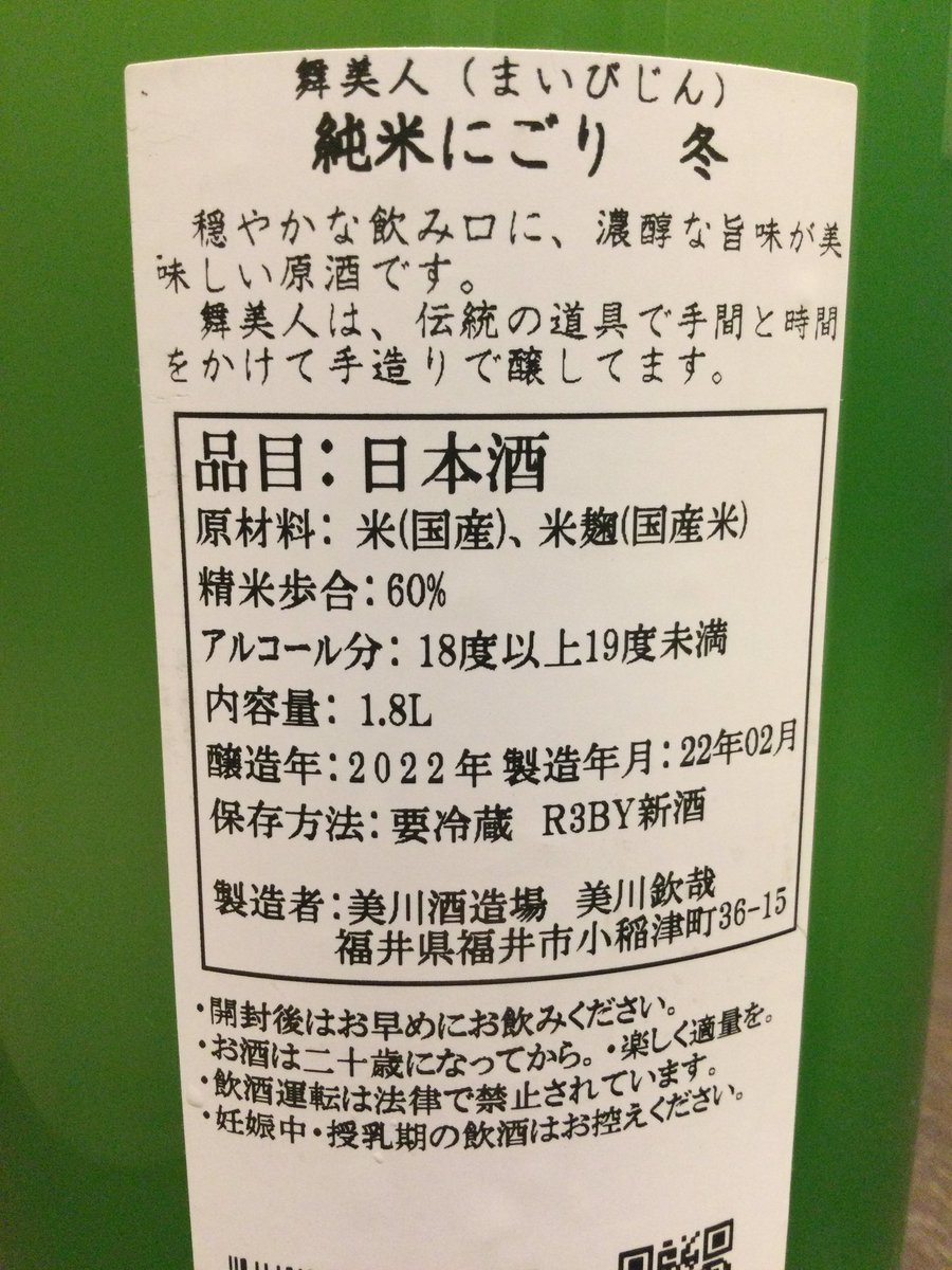 『燗も良し冷も良し特選濁り酒』企画2本目は「舞美人(福井県)純米にごり“冬”」甘さ控えめですごく美味しい濁り酒です。