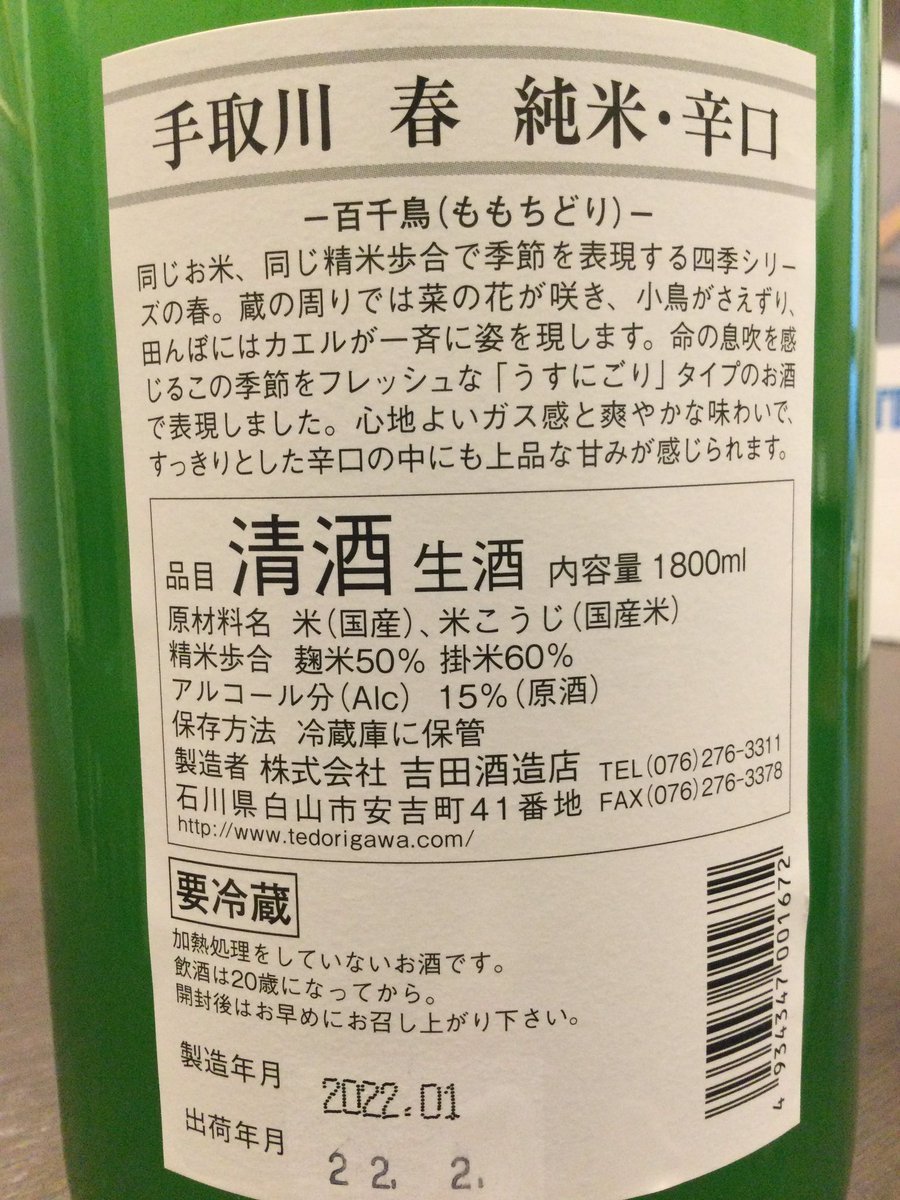 『燗も良し冷も良し特選濁り酒』企画3本目は「手取川(石川県)純米辛口“春”」今日明日は寒波の影響で寒いのでぜひ燗でお試しください。