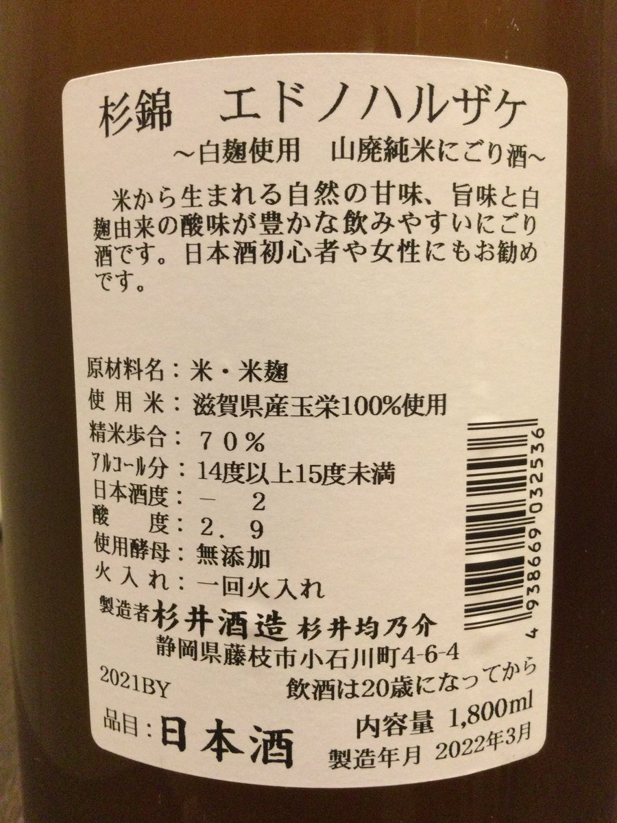 「杉錦(静岡県)山廃純米濁り“エドノハルザケ”」の取り扱いを昨日から始めました。