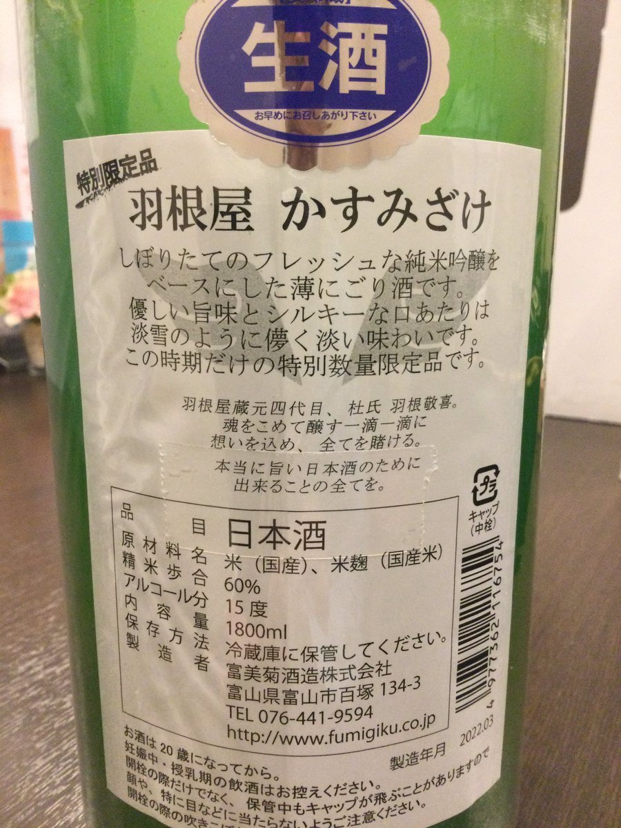 「羽根屋(富山県)純米吟醸“かすみざけ”」昨日届き販売を開始致しました。