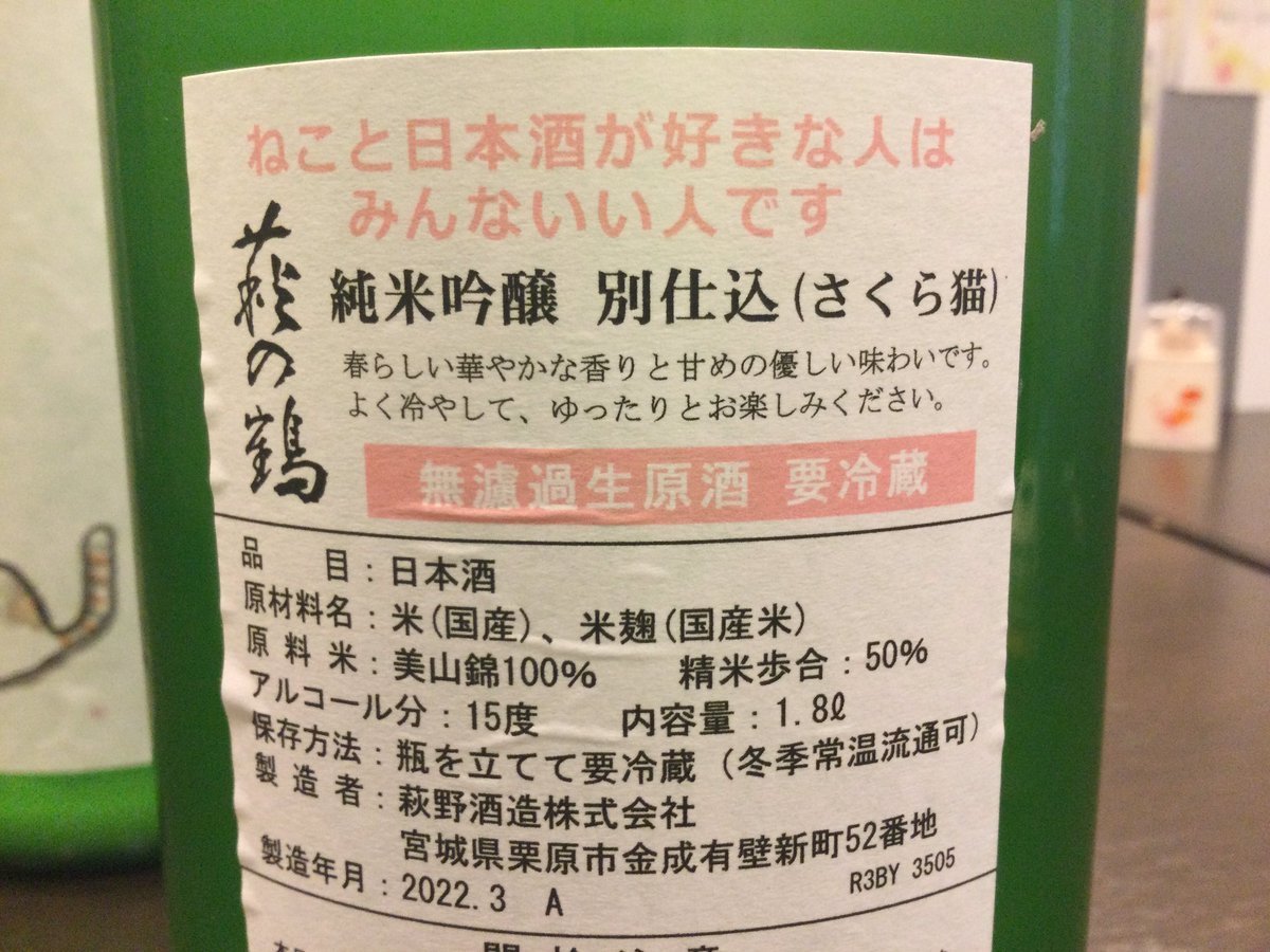 「萩の鶴(宮城県)純米吟醸生原酒“さくら猫”」昨日から提供を開始しました。