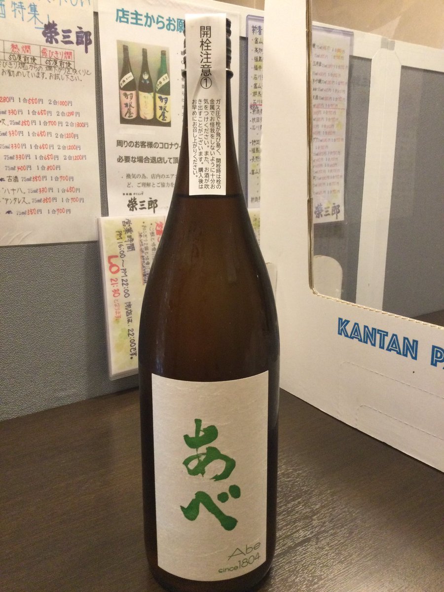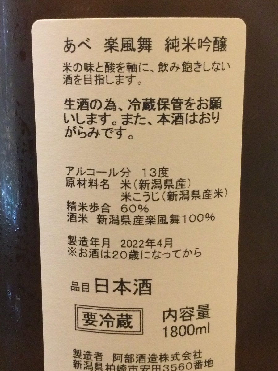 「あべ(新潟県)純米吟醸“楽風舞”」うすにごりで爽やかな酸味、そしてアルコール13°の微発泡、本日から開栓発売します。
