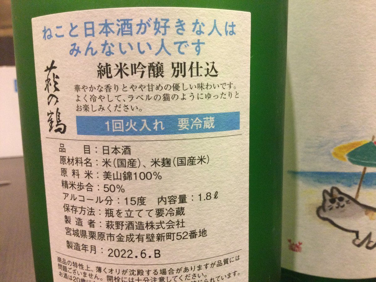 「萩の鶴(宮城県)純米吟醸別仕込“夏のねこ”」が昨夜入荷致しました。